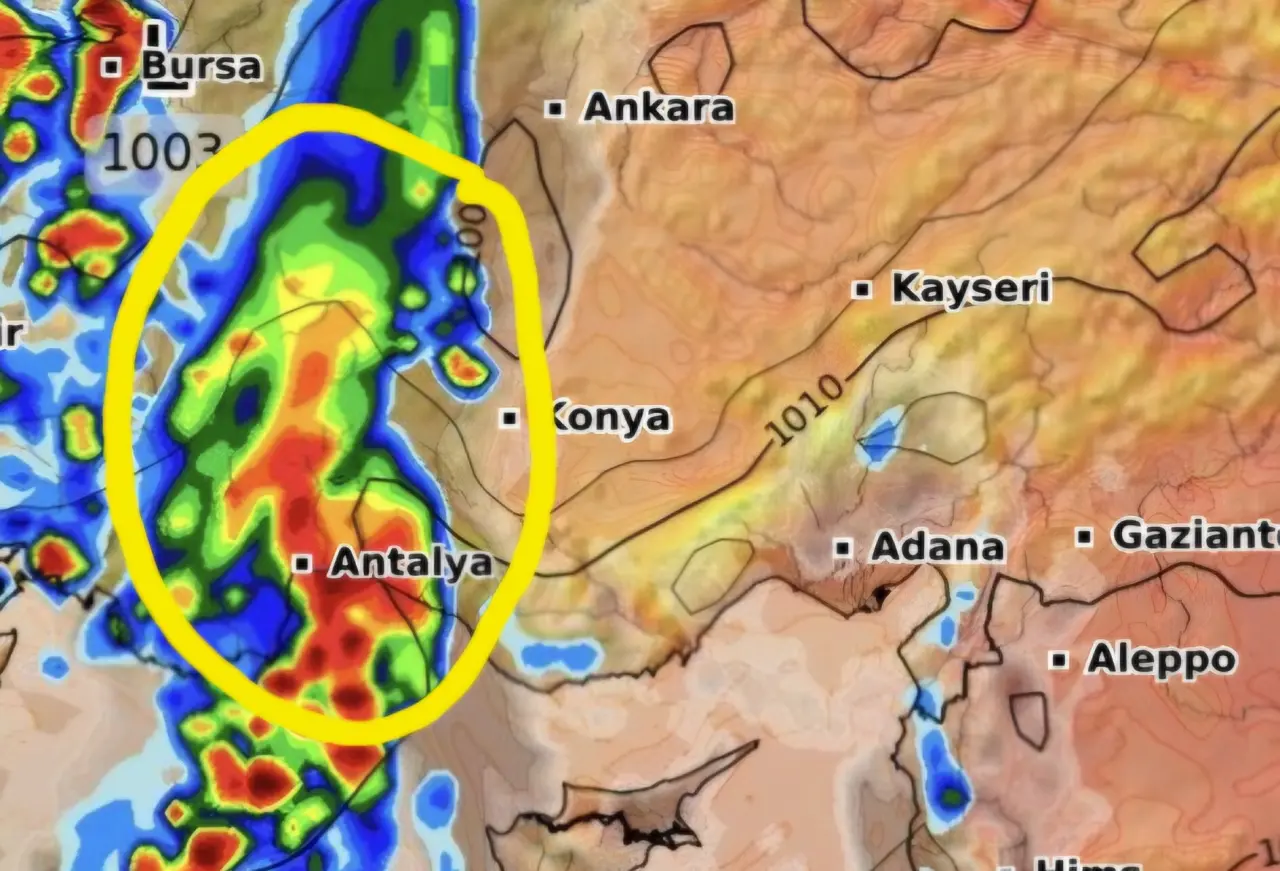 Kuttusi Demir gün vererek, "Salı gecesi için kuvvetli yağış hattını görüyorsunuz. Kuvvetli yağış Konya'ya girişte lodosun fön etkisi ile kuruttuğu hava ile çarpışıp yağış dağılıyor. Lodos beklentisinden kurtulursak güzel bir sistem olur. İnşallah veriler olumlu yönde ilerleme sağlar" şeklinde görüş belirtti.
