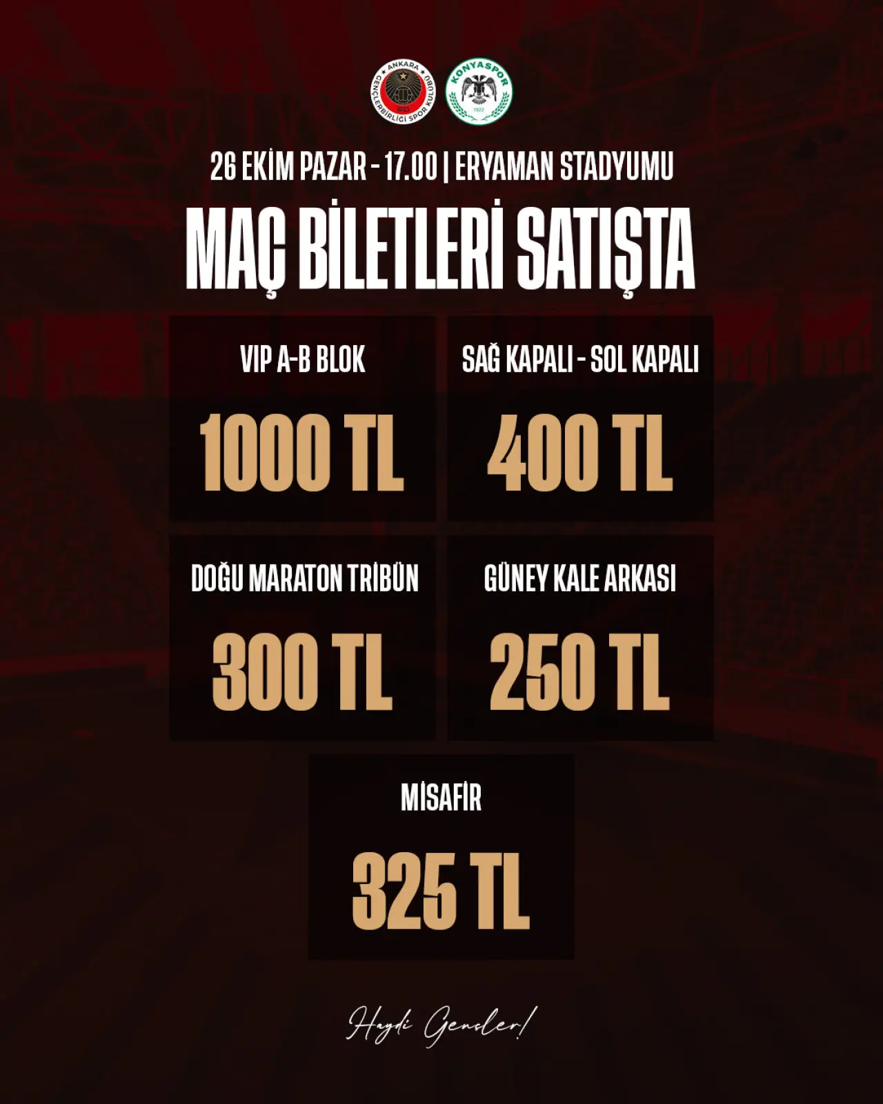 Eryaman Stadyumu’nda oynanacak karşılaşma 26 Ekim Pazar günü saat 17:00’de başlayacak.