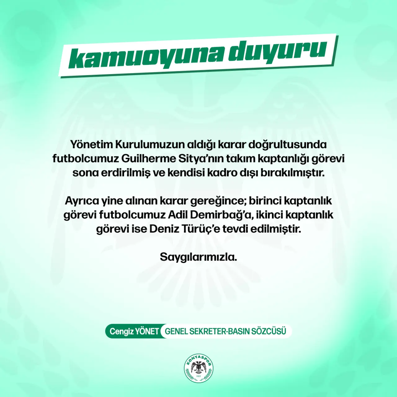 Konyaspor’un yeni kaptanı ise Adil Demirbağ oldu. Kısa bir süre önce bahis skandalına karıştığı için 45 gün hak mahrumiyeti cezası alan Adil takımın en eski isimleri arasında yer alıyordu. Yılmadan mücadelesine devam eden Adil önce formasını geri aldı şimdi de takım kaptanlığına yükseldi. Yeşil-beyazlı ekibin ikinci kaptanı ise Deniz Türüç oldu.