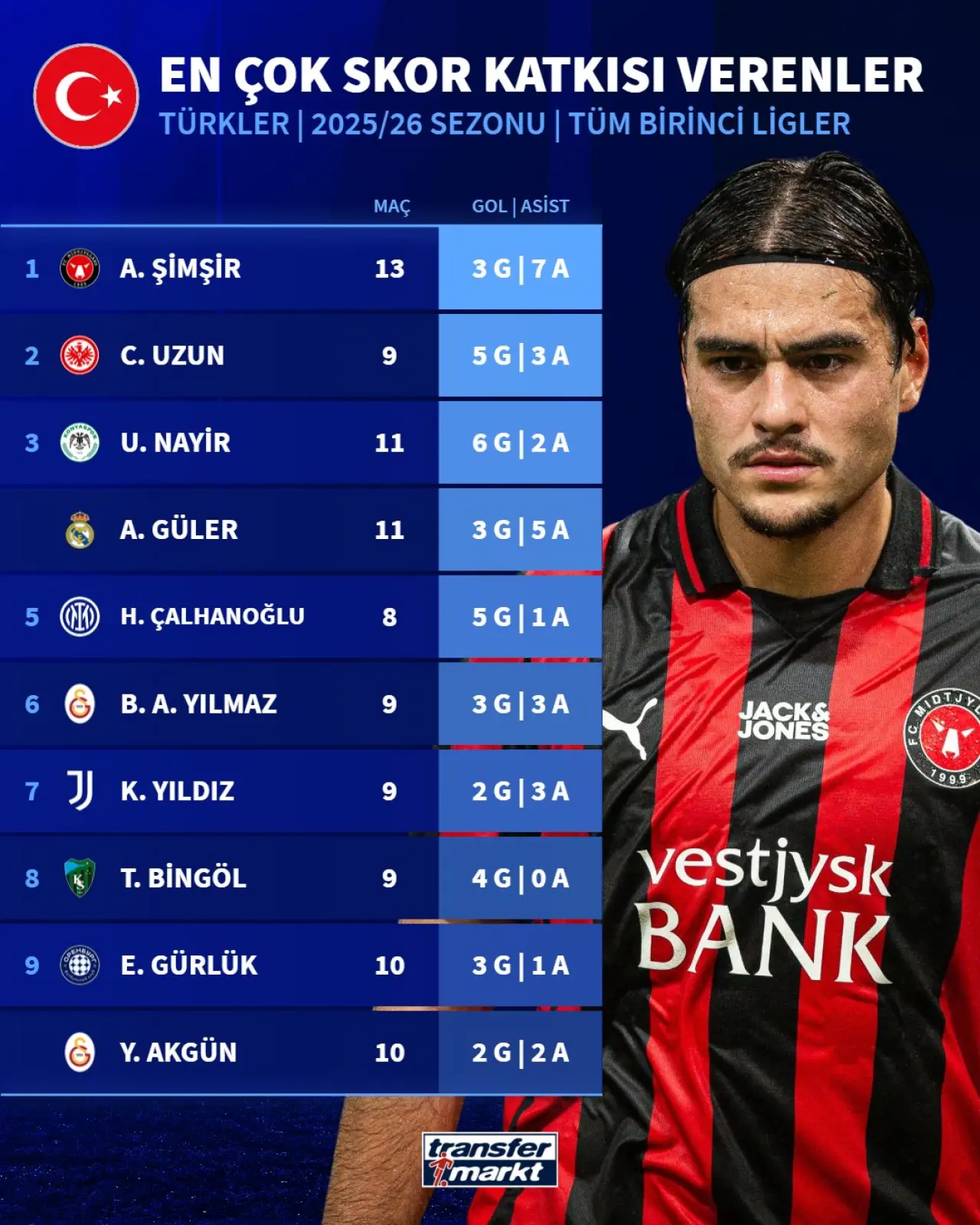 Bu sezon birinci liglerde mücadele edip en çok skor katkısı veren yerli futbolcular arasında ilk sırada 3 gol 7 asistle Aral Şimşir yer aldı.