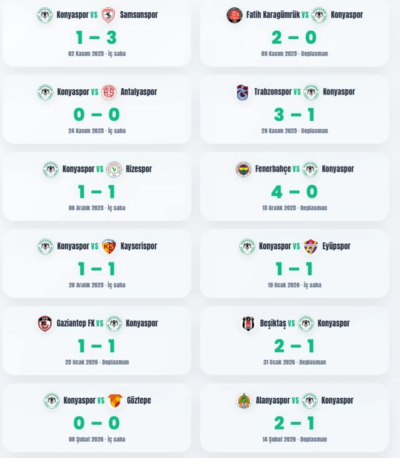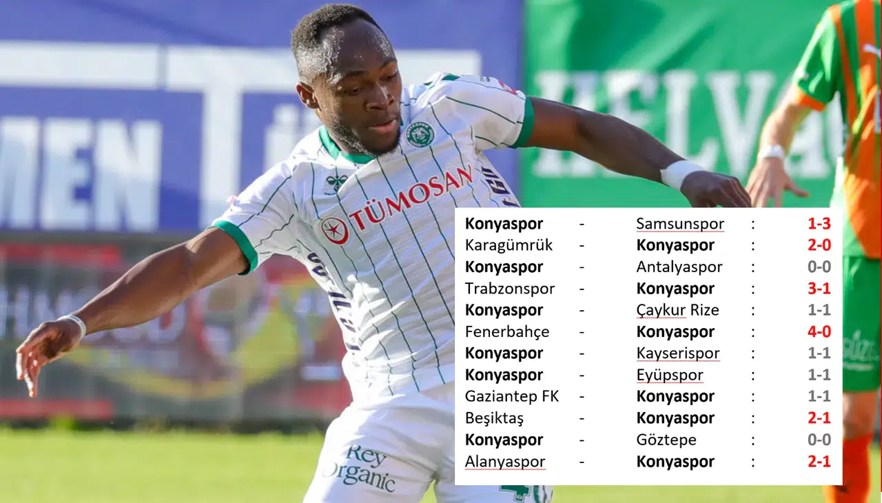 Tam 12 maçtır üç puanı bir arada göremeyen yeşil-beyazlılar, kelimenin tam anlamıyla hafızalardan silinmesi istenen bir süreç yaşıyor. 12 maçta sadece 6 puan toplayabilen ve buna karşın 30 puan kaybı yaşayan Anadolu Kartalı, bu süreçte sadece 8 gol atarken kalesinde 20 gol gördü. Ne kalesini gole kapatabilen ne hücumda istediği üretkenliği sağlayabilen Konyaspor, sezonun ikinci devresinde oynadığı 5 maçta 2 yenilgi alırken 2 maçta ise beraberliği son anda kurtarabildi.