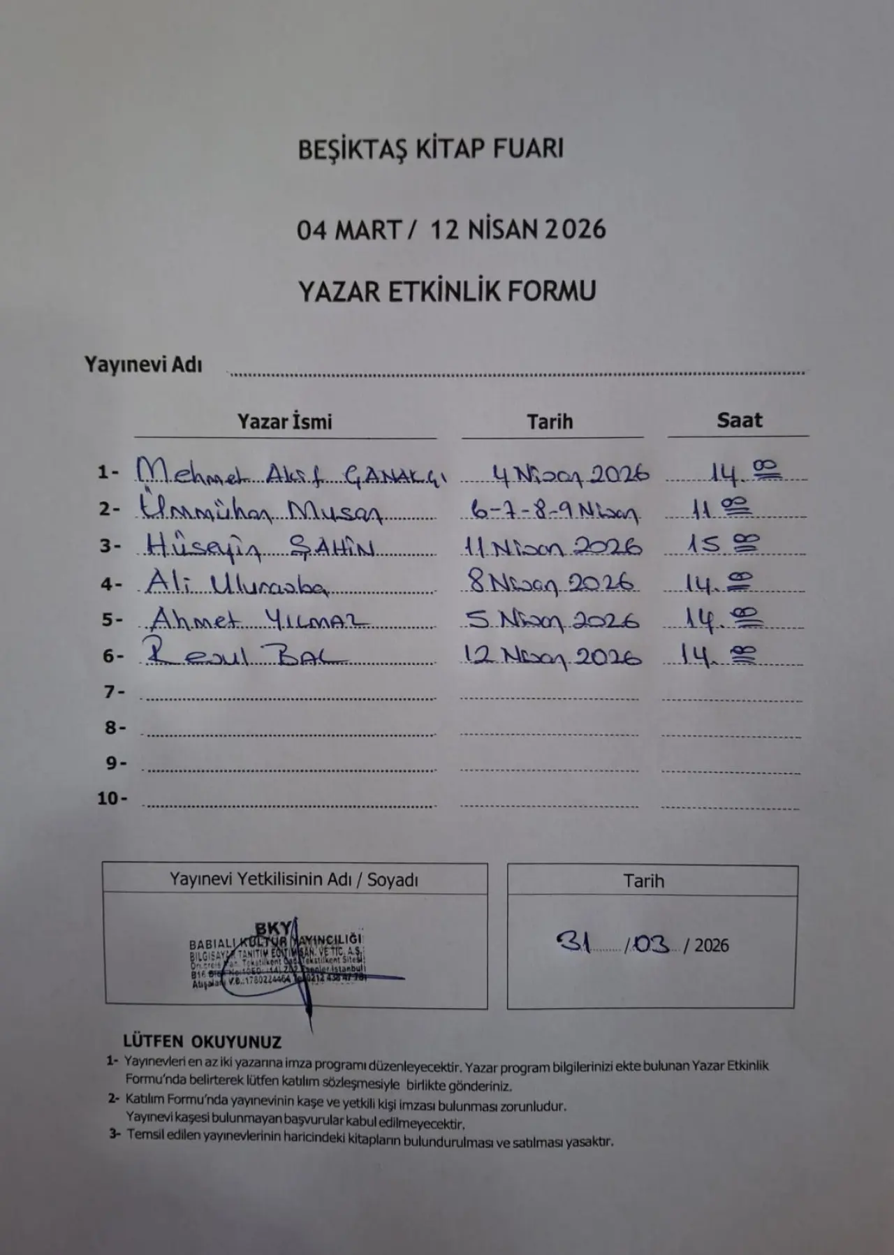 BBN Haber yazarlarımızdan Ali Ulurasba'da 8 Nisan 2026 tarihinde Babıali Kültün Yayınları standında kitaplarını imzalayacak. Yayınevinin yazar imza günleri ve saatleri şöyle: