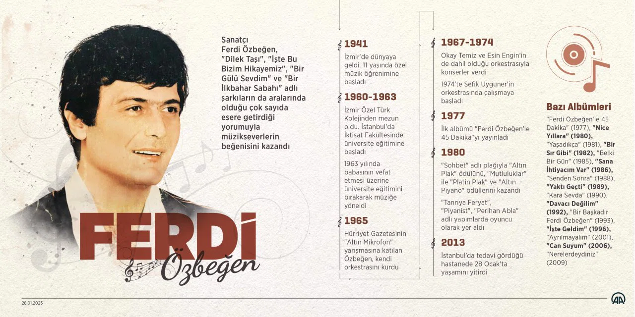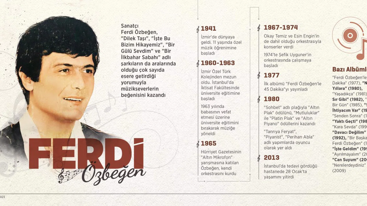 "Dilek Taşı", "İşte Bu Bizim Hikayemiz", "Bir Gülü Sevdim" ve "Bir İlkbahar Sabahı" adlı şarkıların da aralarında olduğu çok sayıda esere getirdiği yorumuyla müzikseverlerin beğenisini kazanan şarkıcı ve piyanist Ferdi Özbeğen'in ölümünün üzerinden 10 yıl geçti.