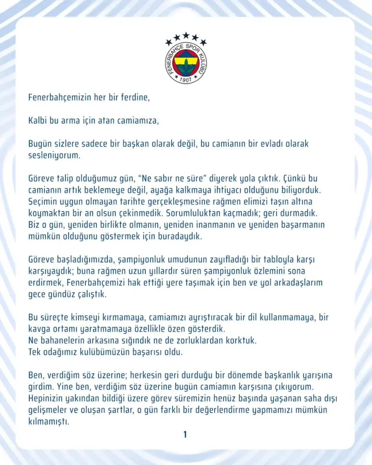 "Benim için bu kararı almak kolay olmadı. Ancak bu koltuk, kişisel tercihlerle değil; doğru zamanda doğru kararları alabilme sorumluluğuyla taşınır. Bu koltuğa gelmek kadar, zamanı geldiğinde bırakabilmek de bir erdemdir. Hele ki bunu kırgınlıkla değil, bir hırsla değil; camianın önünü açma sorumluluğuyla, Fenerbahçemizin geleceğini düşünerek yapabilmek… İşte asıl mesele budur."