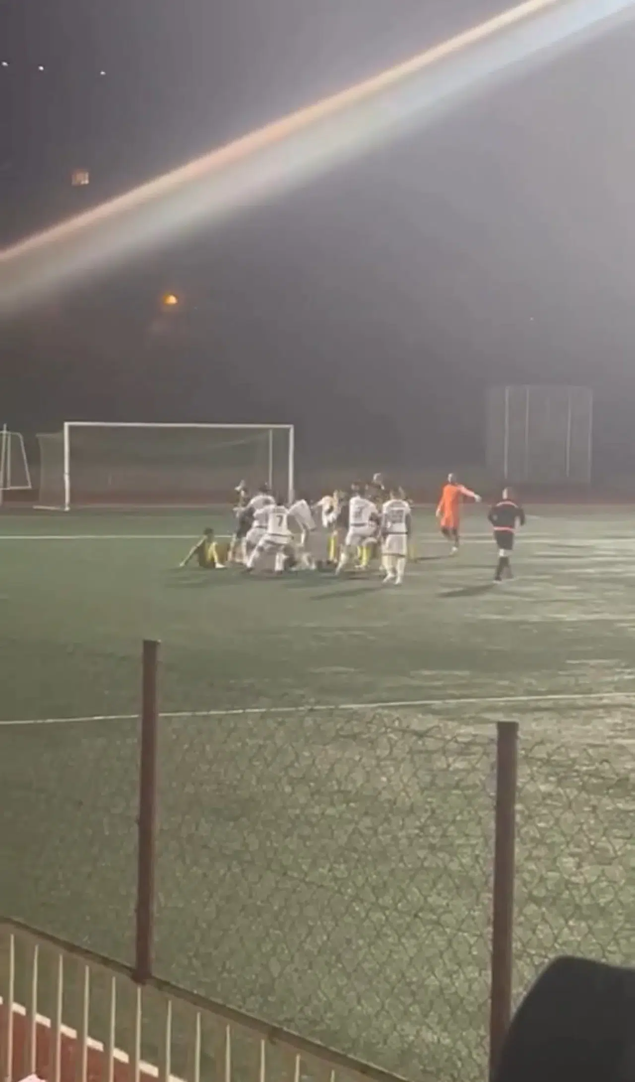 Bir anda savaş alanına dönen sahada futbolcular tekme ve yumruklarla birbirine girdi. O anlar ise maçı izlemek için tribünde bulunan bir vatandaş tarafından cep telefonuyla görüntülendi.