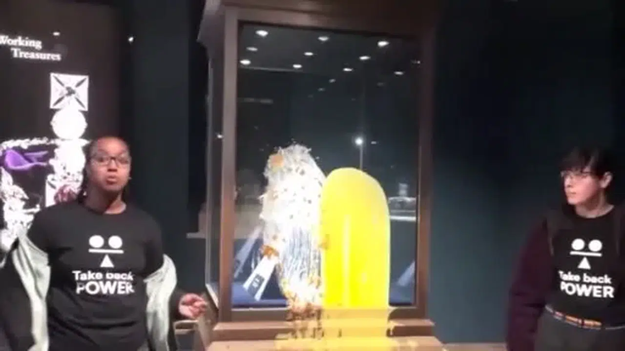 İngiltere Kraliyet ailesine ait mücevherlerin sergilendiği Londra Kalesi'nde yaşanan olayda kendini "sivil direniş grubu" olarak tanıtan "Gücü Geri Al" (Take Back Power) adlı grubun üyeleri tacın etrafındaki cam korumaya muhallebi ve kırıntılı elma tatlısı fırlattı. Yetkililer göstericilere hızlı bir şekilde müdahale ederken yanlarında "Zenginleri vergilendirin" yazılı afişler taşıyan göstericiler, "Demokrasi parçalandı. İngiltere çökmüş halde. Zenginler varlıklarına varlık katarken sokakta ölen evsizler var. Yılın bu zamanları onlar için en zor dönem. Bu iğrenç bir durum" sloganlarını attı.