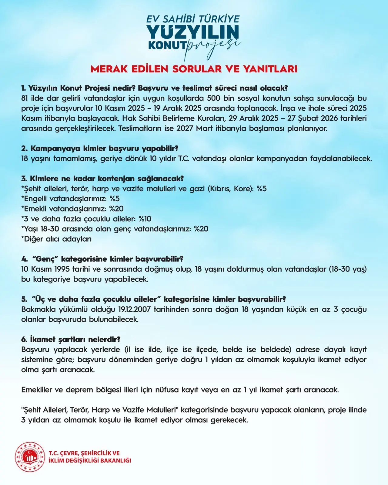 Çevre, Şehircilik ve İklim Değişikliği Bakanı Murat Kurum, 81 ilde 500 bin sosyal konutun inşa edileceği, "Yüzyılın Konut Projesi" ile ilgili merak edilen soruları ve yanıtlarını sosyal medya hesabından paylaştı. Bakan Kurum, "Yüzyılın Konut Projesi'ne vatandaşlarımızın ilgisi büyük. Projemize ilişkin birçok soru alıyoruz. En çok merak edilen konularla ilgili soruları yanıtladık" mesajını verdi.