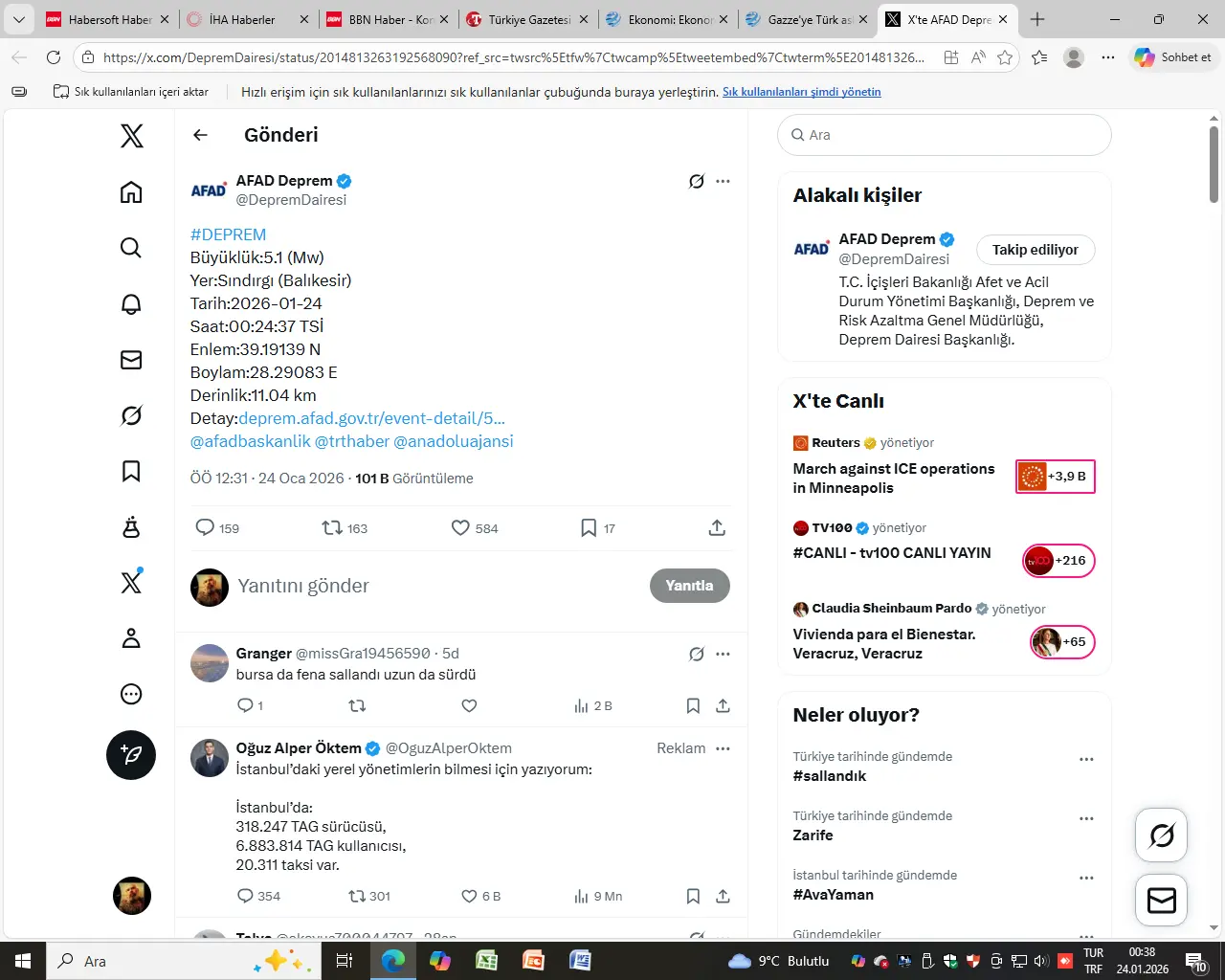 Merkez üssü Balıkesir'de 5.2 büyüklüğünde deprem meydana geldi. İstanbul, İzmir ve Bursa başta olmak üzere birçok ilde hissedildi.