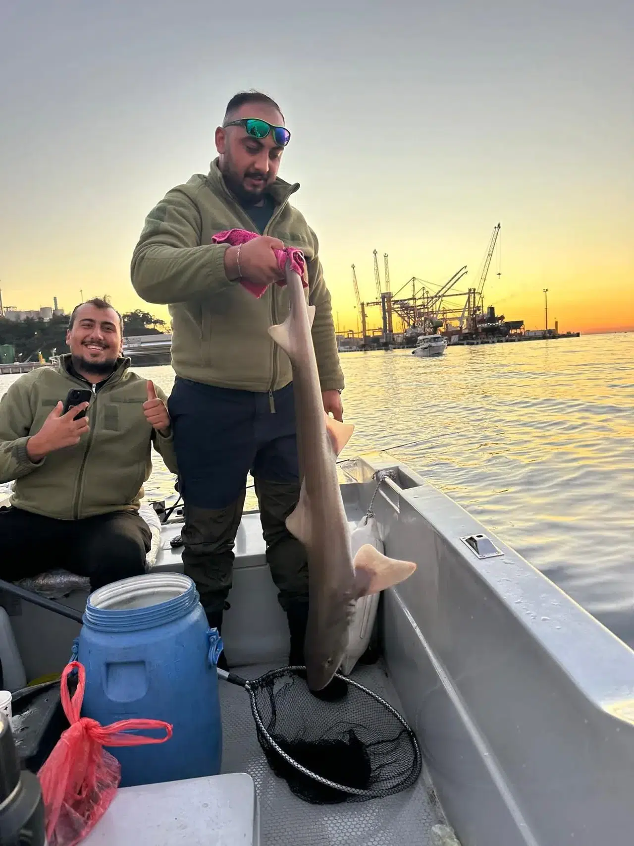 Gemlik Körfezi'nde denize açılan balıkçılar, oltalarına takılan canlının köpek balığı olduğunu fark etti. Kısa süreli şaşkınlık yaşayan balıkçılar, dikkatli bir şekilde köpek balığını tekneye almayı başardı.