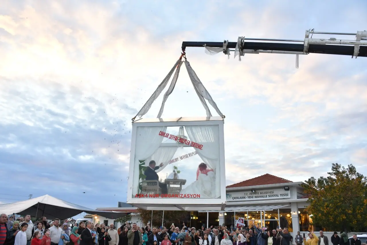 Fethiye ve Seydikemer ilçelerinin siyaset, esnaf ve ticaret dünyasından yoğun katılımın olduğu düğün töreninde gelin almaya özel yaptırılıp tıra yüklenen cam vitrin ile gidildi. Cam vitrin kız evinde vinçle tırdan indirilirken, gelin Merve Sarıman ve damat Berat Çetinkaya dualarla cam vitrine girdi. Cam vitrin vinçle tekrar tıra alkışlar arasında yüklendi. Gelini alan damat tarafları konvoy eşliğinde Seydikemer ilçesinden Fethiye'ye hareket etti.