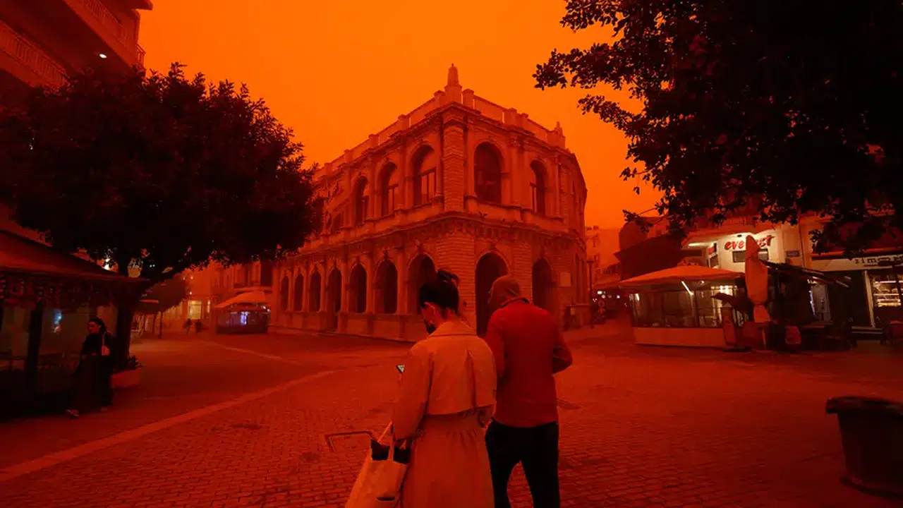 Yunanistan'ın Girit Adası'nda gökyüzü, Afrika'dan gelen çöl tozlarının etkisiyle kızıla boyandı.