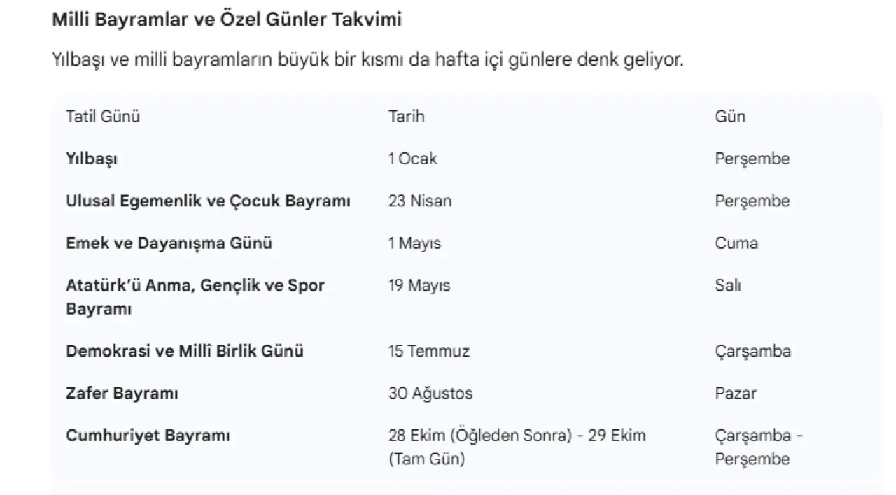 2026 yılında 30 Ağustos Zafer Bayramı'nın Pazar gününe denk gelmesi, hafta sonu tatili dışında ek bir izin sağlamayacak. Ancak 1 Mayıs Cuma günü ve 29 Ekim Perşembe günü tatilleri, hafta sonu ile birleştirme potansiyeli sunuyor.