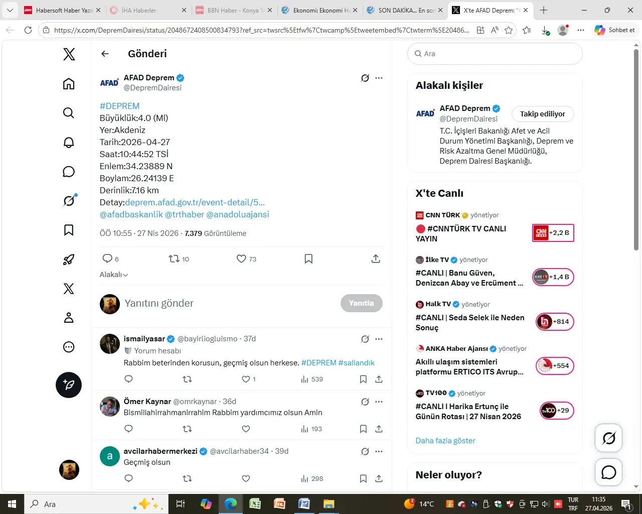 Afet ve Acil Durum Yönetim Başkanlığı, Akdeniz'de 4.0 büyüklüğünde deprem meydana geldiğini duyurdu.