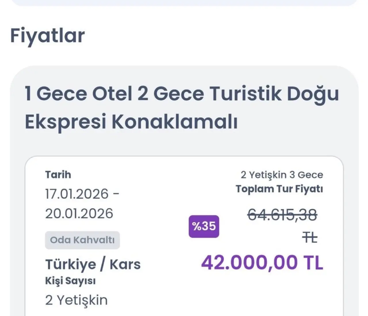 Turistik Doğu Ekspresi'nin kış sezonu seferleri 22 Aralık'ta başlıyor. Gidiş dönüş tren bileti, 1 gece konaklama iki kişi için 42.000 TL olarak belirlenirken çok sayıda sosyal medya kullanıcısı bu duruma tepki gösterdi.