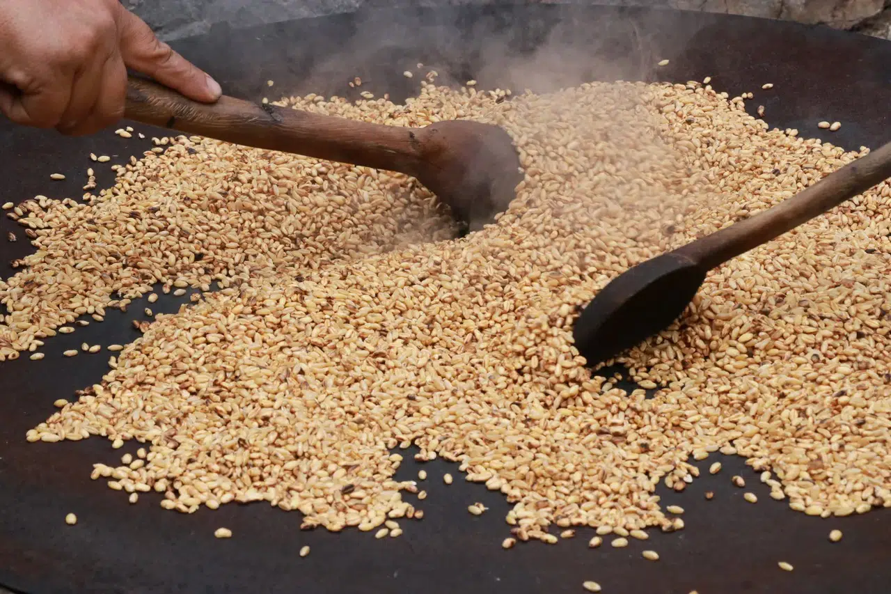 Kavut ununun yapım sürecinin oldukça zahmetli olduğunu belirten Çakar, kullanılan malzemelerin tek tek seçildiğini ve odun ateşinde, köz üzerinde yavaş yavaş kavrulduğunu ifade etti. Yaklaşık 6-7 saat süren kavurma işlemi, kavut ununa kendine özgü aromasını kazandırıyor. Kavurma işleminin ardından soğutulan ürünler, geleneksel değirmenlerde undan biraz daha iri olacak şekilde öğütülüyor. Öğütme işlemi tamamlandıktan sonra kavut unu, genellikle pekmezle karıştırılarak tatlı olarak tüketiliyor. Bu yöntem, geçmişten günümüze değişmeden gelen bir sunum şekli olarak dikkat çekiyor.