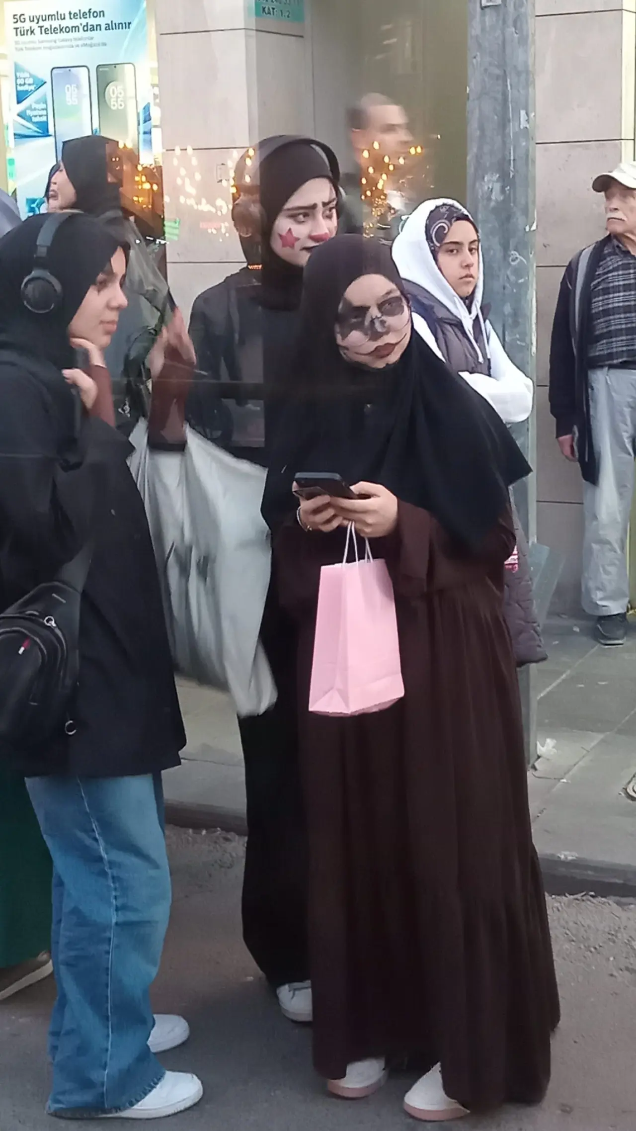 Genç kızların yüzlerinin ilginç biçimde boyalı olması herkesin dikkatini çekti. Zafer Meydanı toplu taşıma durağında otobüs bekleyen genç kızlar kimseye aldırış etmedi. Bu arada genç kızların bu hali karşısında yorumlar da yapıldı.