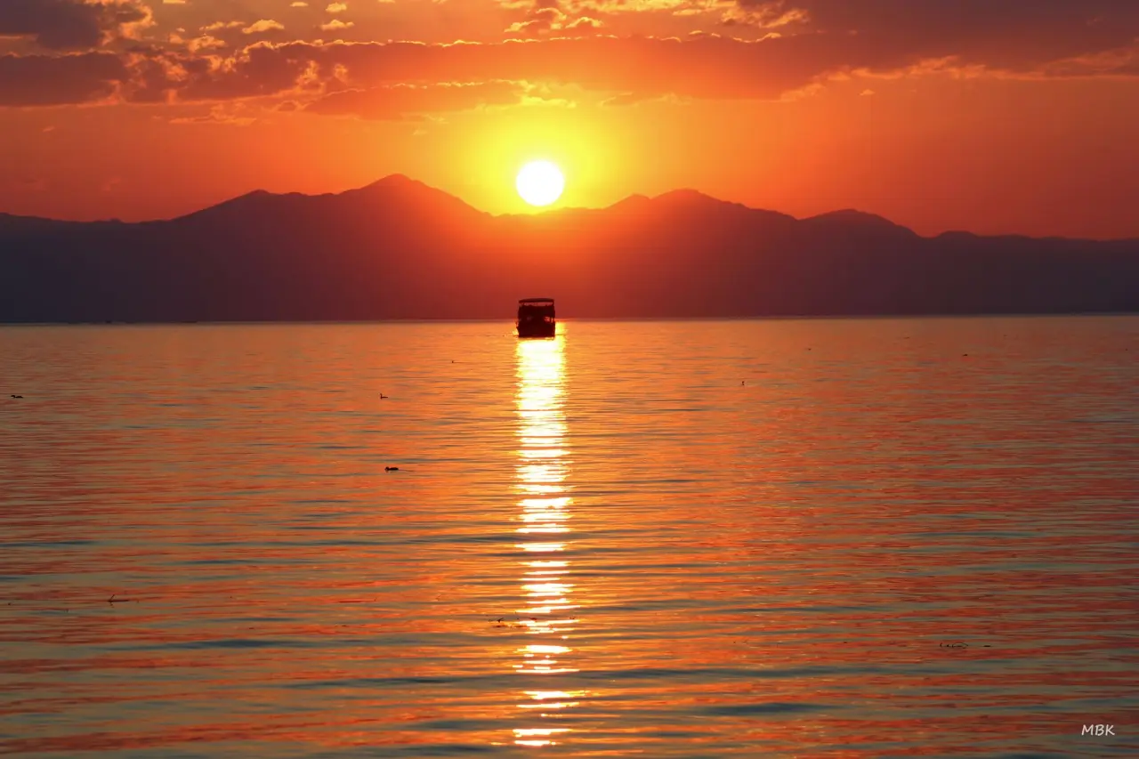 Beyşehir’de gün batarken göl suları kızılın yüzlerce ışıltısıyla rengarenk kesilir.