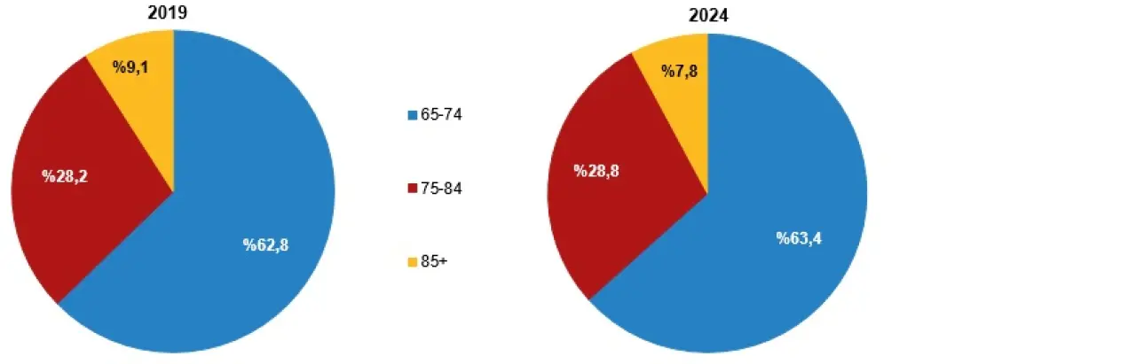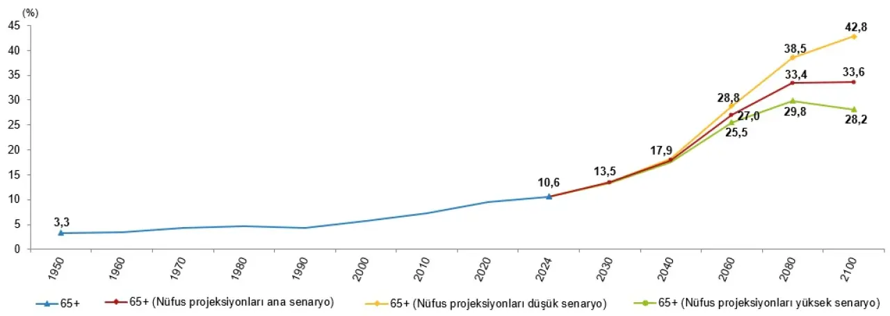 TÜİK verilerine göre yaşlı nüfus olarak kabul edilen 65 ve daha yukarı yaştaki nüfus, 2019 yılında 7 milyon 550 bin 727 kişi iken son beş yılda %20,7 artarak 2024 yılında 9 milyon 112 bin 298 kişi oldu. Yaşlı nüfusun toplam nüfus içindeki oranı ise 2019 yılında %9,1 iken, 2024 yılında %10,6'ya yükseldi. Yaşlı nüfusun 2024 yılında %44,6'sını erkek nüfus, %55,4'ünü kadın nüfus oluşturdu. Türkiye demografik risk altında.